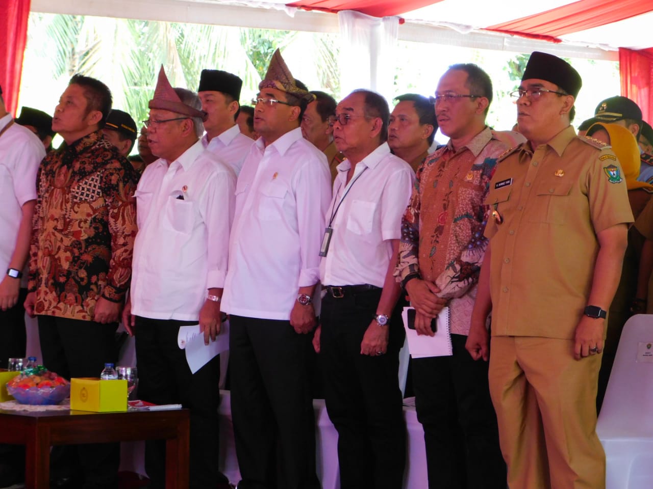 Menteri PU PR, Menteri Perhubungan, Gubernur Sumsel dan Bupati Muara Enim beserta tamu undangan lainnya saat menyanyikan lagu Indonesia Raya