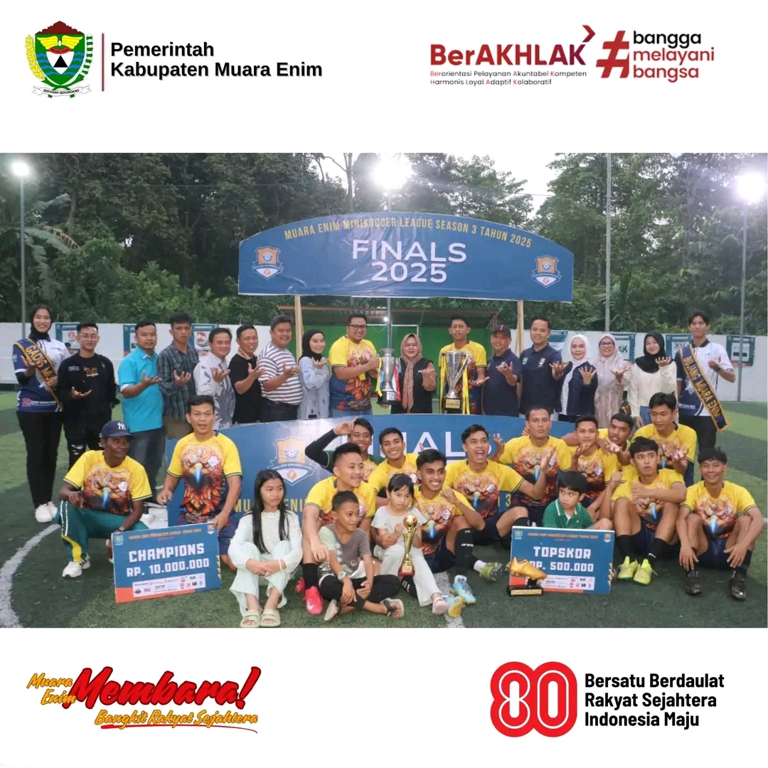 Hal ini disampaikan Wakil Bupati dalam penutupan gelaran Muara Enim Minisoccer League Season 3 Tahun 2025 yang berlangsung di Lapangan Rafferta Minisoccer Desa Muara Lawai Kecamatan Muara Enim, Minggu (03/08/2025).