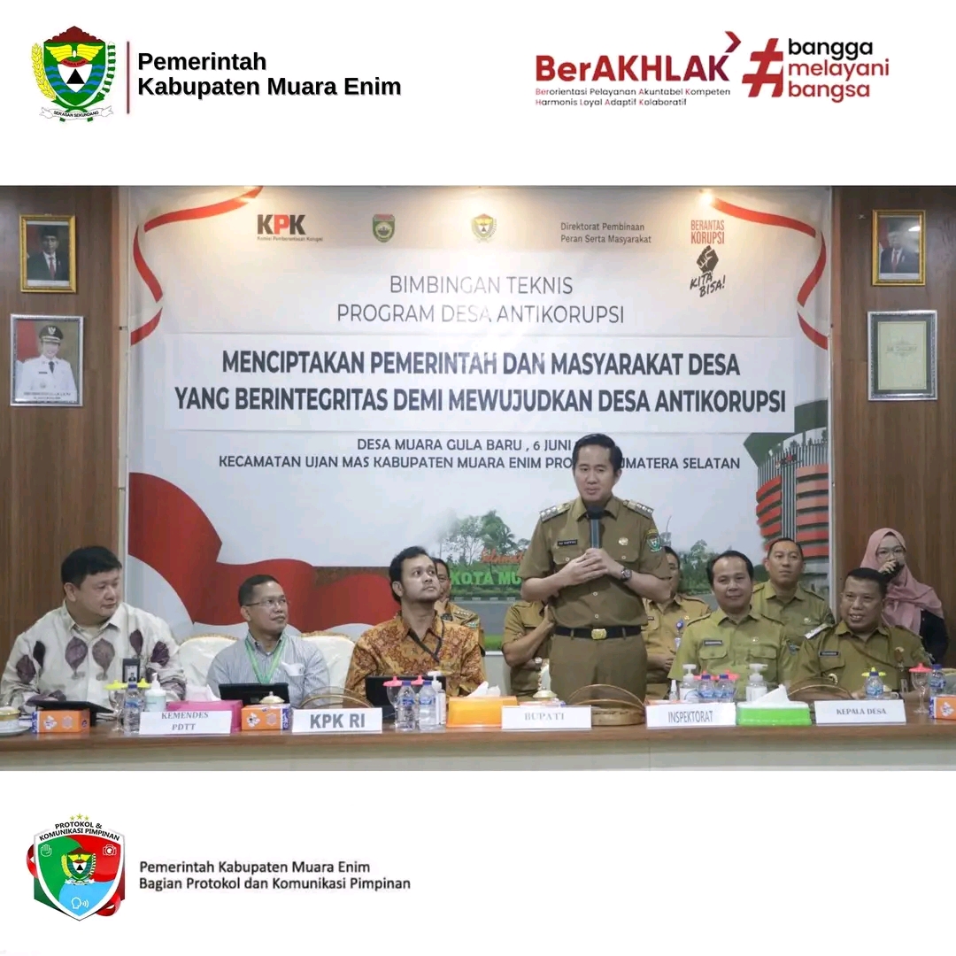 Adapun bimtek yang dihadiri narasumber dari KPR RI diwakili Kepala Satgas Direktorat Pembinaan Peran Serta Masyarakat (Dipermas), Rino Haruno, Tim Observasi Dipermas, Friesmount Wongso dan perwakilan Kemendes-PDTT RI, Plt. Bupati menyampaikan terima kasih atas motivasi kepada narasumber yang telah membantu mewujudkan integritas penyelenggaraan pemerintah desa antikorupsi diwilayah Kabupaten Muara Enim khususnya di Desa Muara Gula Baru.