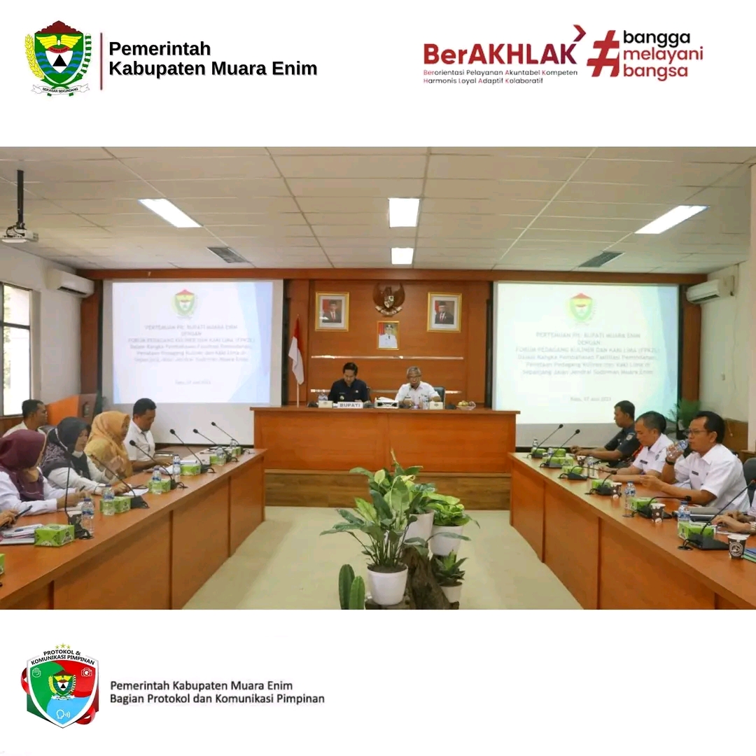 MUARA ENIM I galikabar.com – Bermula dari usulan yang disampaikan Forum Pedagang Kuliner dan Kaki Lima (FPKKL) terkait permohonan fasilitasi pemindahan lokasi berjualan kepada Plt. Bupati Muara Enim, Ahmad Usmarwi Kaffah, S.H., LL.M., LL.M., Ph.D. Rabu (07/06/2023) bertempat di Ruang Rapat Serasan Sekundang, Kantor Bupati Muara Enim, Plt. Bupati didampingi Kepala Dinas Perdagangan, Syarpuddin, S.Sos. M.Si., beserta para kepala perangkat daerah lainnya menggelar rapat koordinasi dengan mengundang para Pedagang Kaki Lima (PKL) dan kuliner untuk bersilahturahmi sekaligus membahas permohonan pemindahan lokasi berjualan para pedagang di sepanjang Jalan Jenderal Sudirman, Mambo 1 dan Mambo 2, Kecamatan Muara Enim.