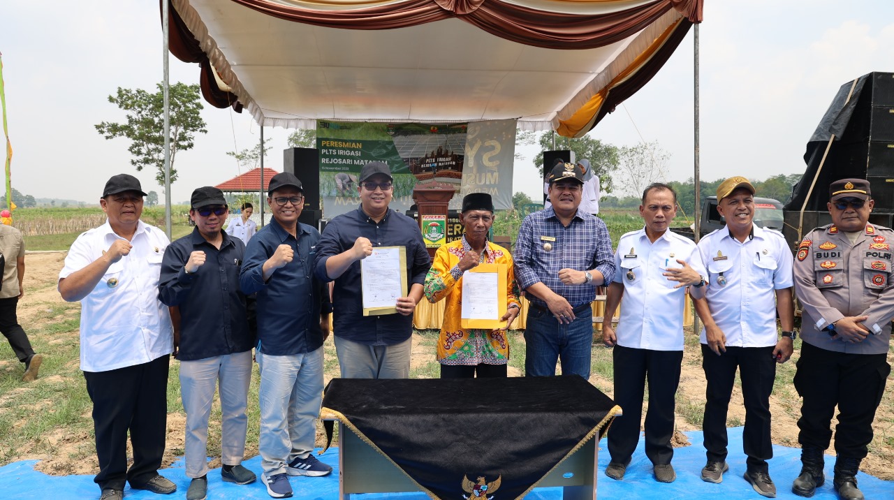 LAMPUNG TENGAH I galikabar.com – Pembangkit Listrik Tenaga Surya (PLTS) untuk irigasi lahan pertanian di Kampung Rejosari Mataram, Kecamatan Seputih Mataram, Kabupaten Lampung Tengah diresmikan oleh Bupati Lampung Tengah Musa Ahmad dan VP Sustainability PT Bukit Asam Tbk (PTBA) Hartono pada Rabu (15/11/2023).